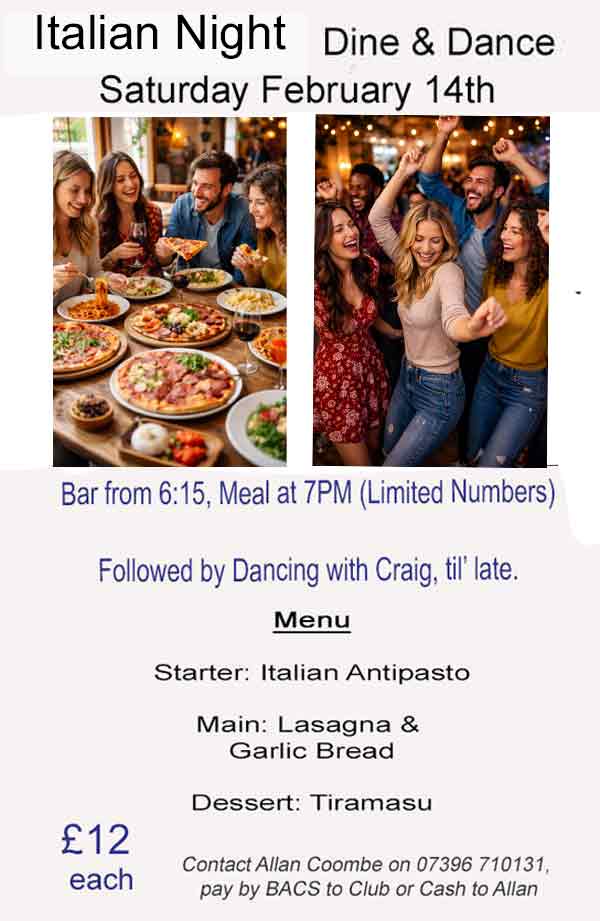 Craig and Maria have offered to open the club bar on the first Thursday night of the month from 6pm. (apart from 1st January 2026) Starting in November 2025 for members wishing to go and socialise at the club. Next opening will be on Thursday 4th December.